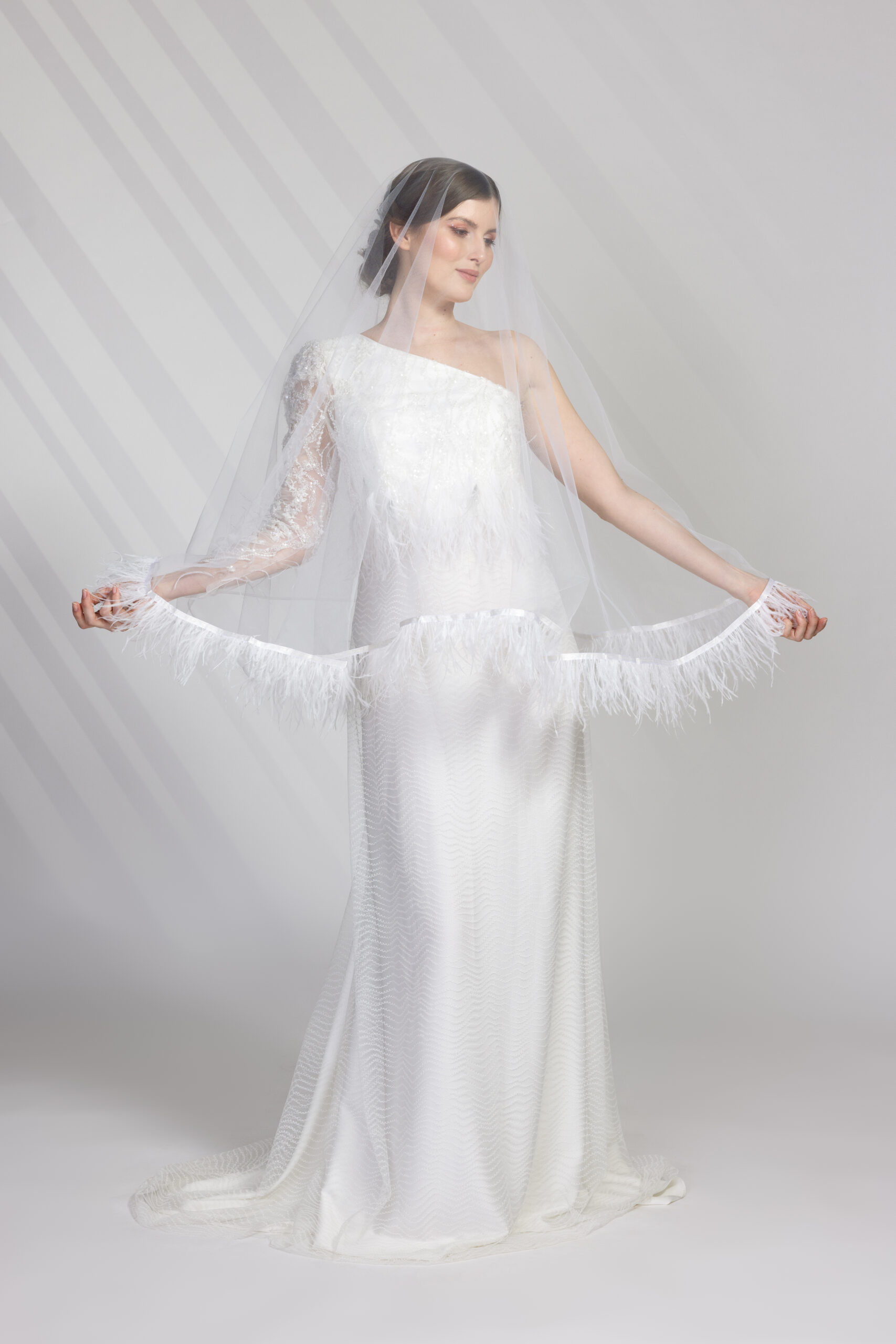 Se šaty je možné ještě kombinovat závoj taktéž zdobený pštrosím peřím. Závojový tyl hustší gramáže zvýrazní tvar závoje. Dodává šatům fashion nádech.